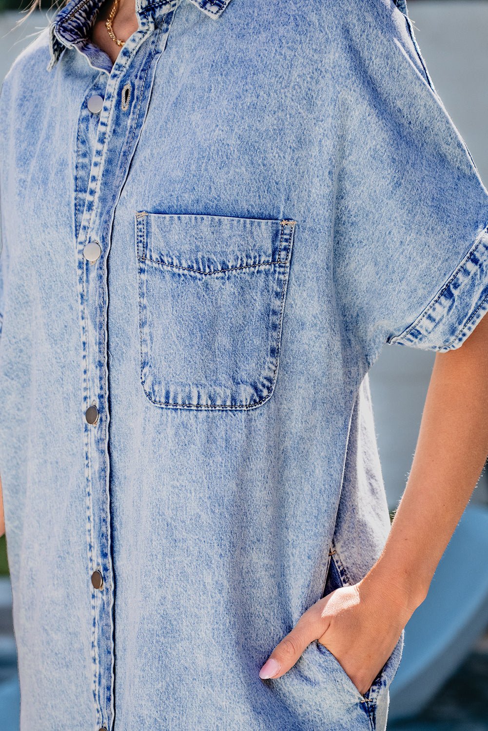 Light Blue Loose Medium Wash Short Sleeve Shirt Chambray Dress